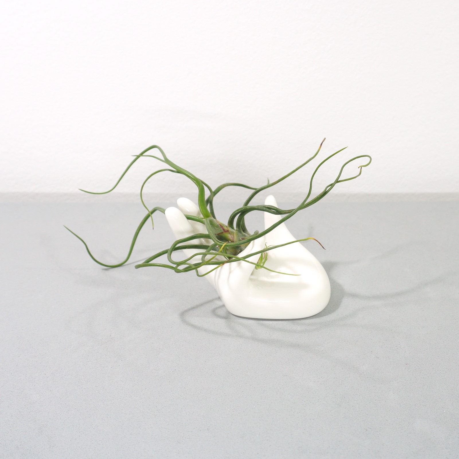 Realça a beleza da tua Tillandsia bulbosa com este suporte de cerâmica em forma de mão, ideal para criar uma peça decorativa elegante e original. A planta é colocada cuidadosamente na palma da mão, ficando em destaque e criando um efeito visual único e harmonioso.