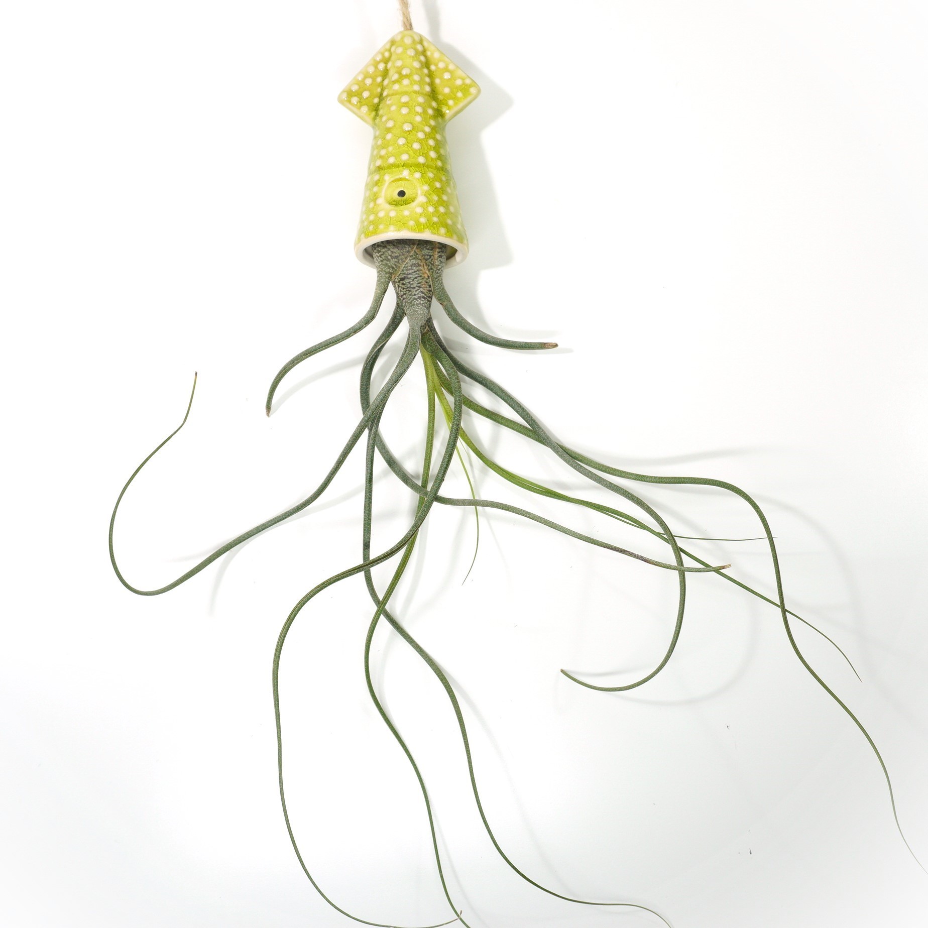 Realça a beleza da tua Tillandsia butzii com este suporte de cerâmica em forma de lula, ideal para criar uma peça decorativa original e divertida. A planta prende-se na peça com um cordel ou arame, garantindo que fique segura e bem posicionada.