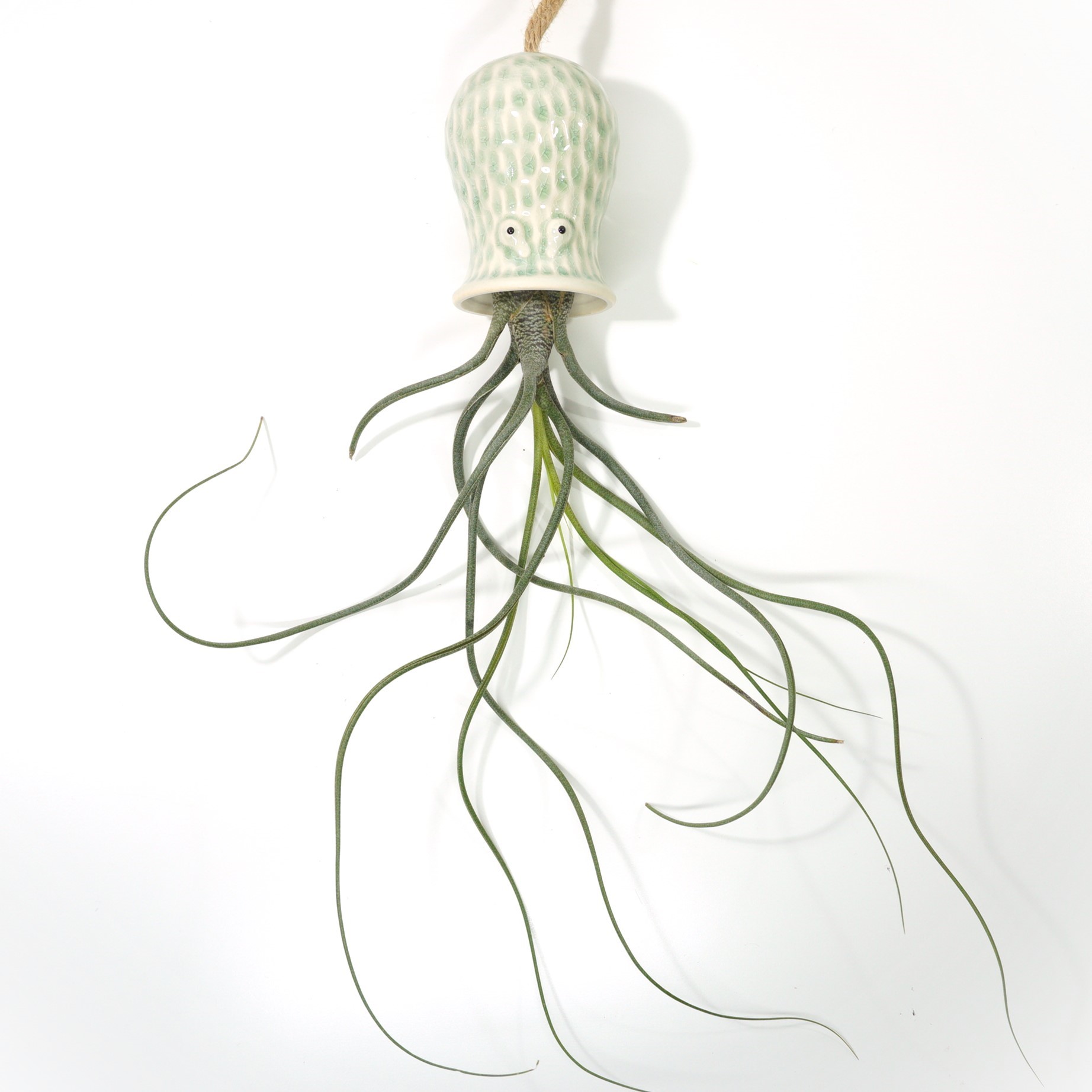 Realça a beleza da tua Tillandsia butzii com este suporte de cerâmica em forma de polvo, ideal para criar uma decoração aérea divertida e original. A planta prende-se na peça com um cordel ou arame, garantindo que fique segura e bem posicionada.