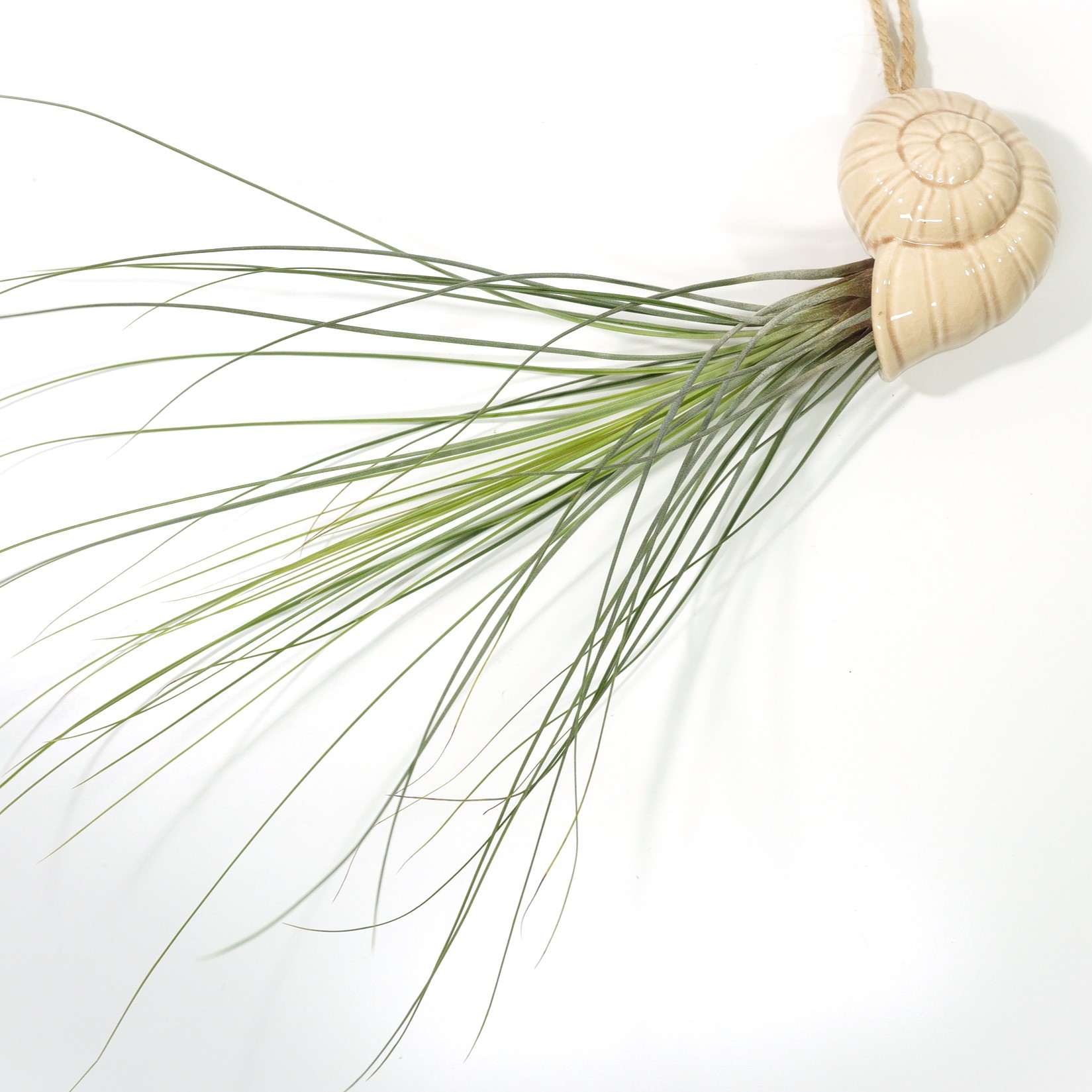 Realça a beleza da tua Tillandsia juncea com este suporte de cerâmica em forma de caracol do mar, adicionando um elemento decorativo e original à tua decoração. Inspirado nas conchas marinhas frequentemente associadas ao caranguejo-eremita. A planta prende-se na peça com um cordel ou arame, garantindo que fique segura e bem posicionada.