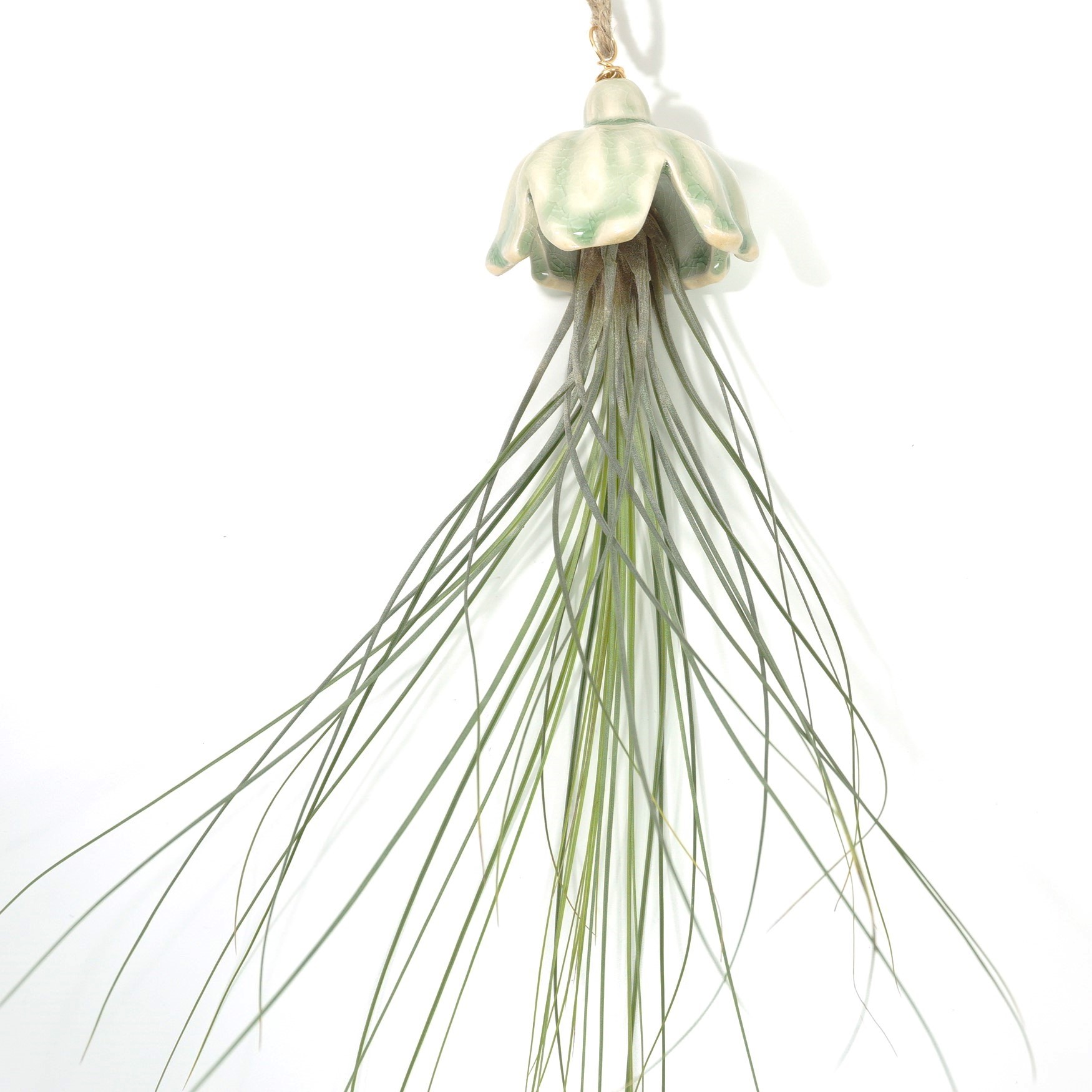 Realça a beleza da tua Tillandsia juncea com este suporte de cerâmica em forma de flor, ideal para criar uma peça decorativa elegante e original. A planta prende-se na flor com um cordel ou arame, garantindo que fique segura e bem posicionada.
