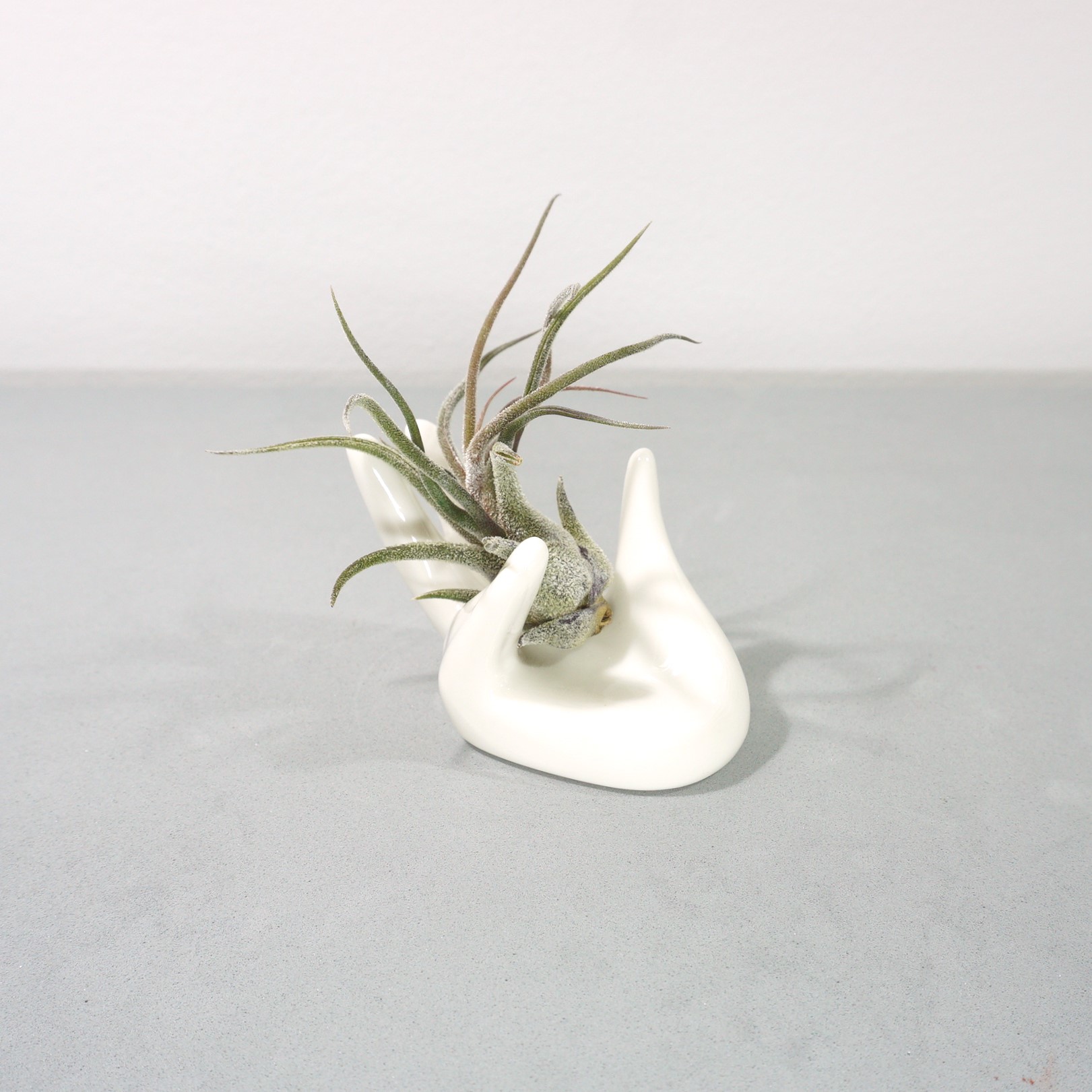Realça a beleza da tua Tillandsia pruinosa com este suporte de cerâmica em forma de mão, ideal para criar uma peça decorativa elegante e original. A planta é colocada cuidadosamente na palma da mão, ficando em destaque e criando um efeito visual harmonioso e moderno.
