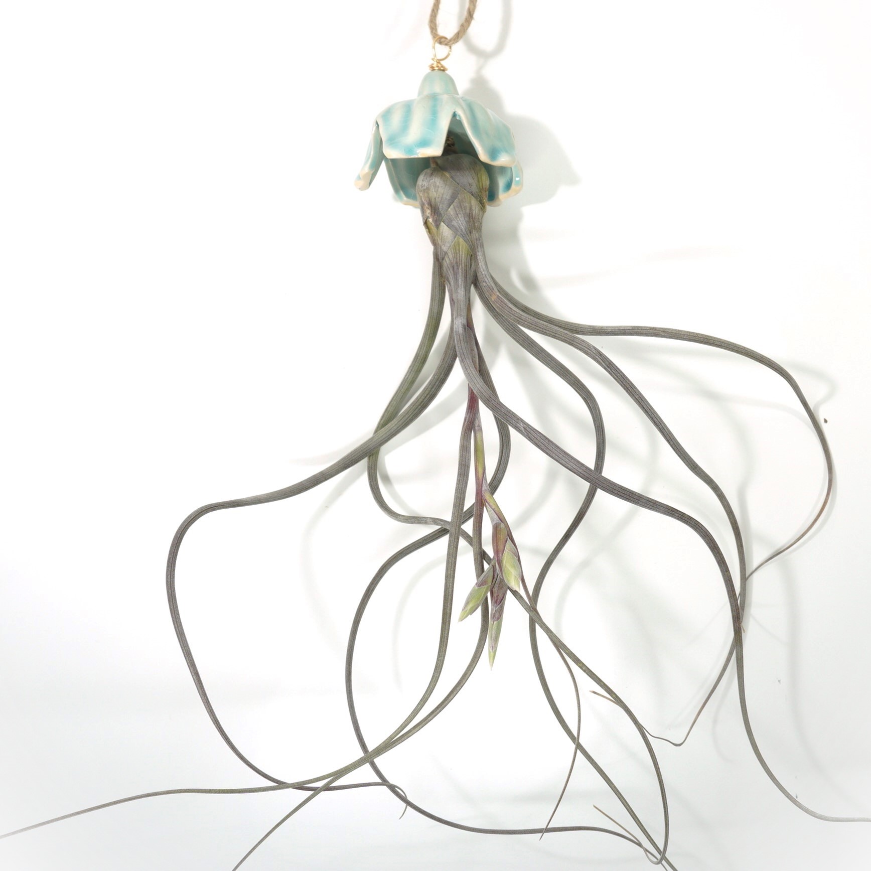 Realça a beleza da tua Tillandsia pseudobaileyi com este suporte de cerâmica em forma de flor, ideal para criar uma peça decorativa elegante e cheia de personalidade. A planta prende-se na flor com um cordel ou arame, garantindo que fique segura e bem posicionada.