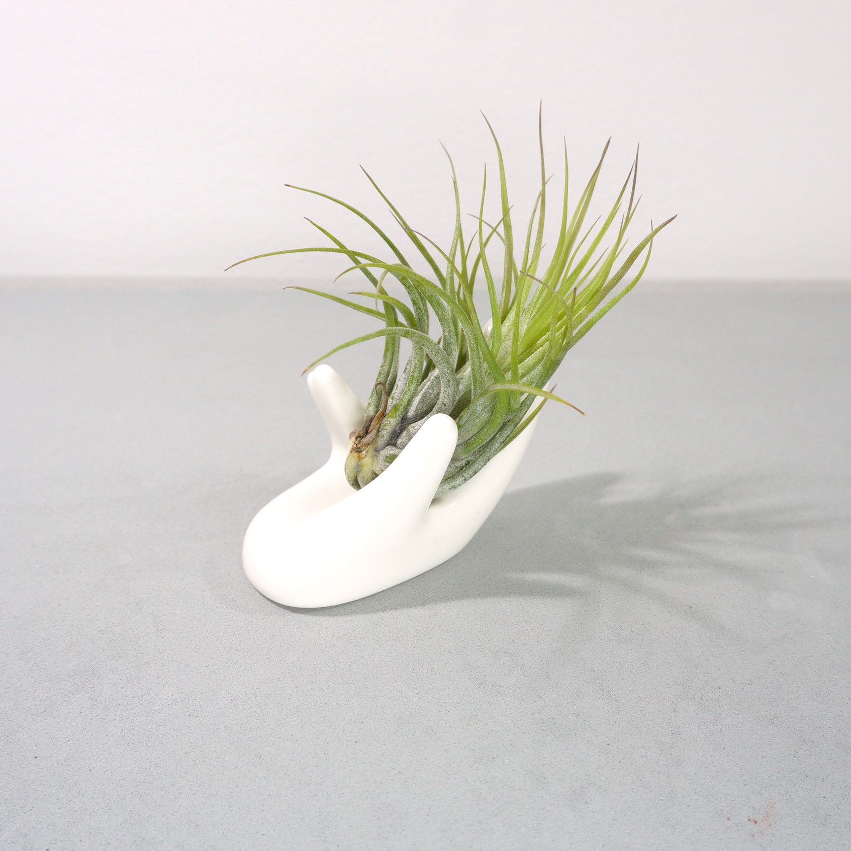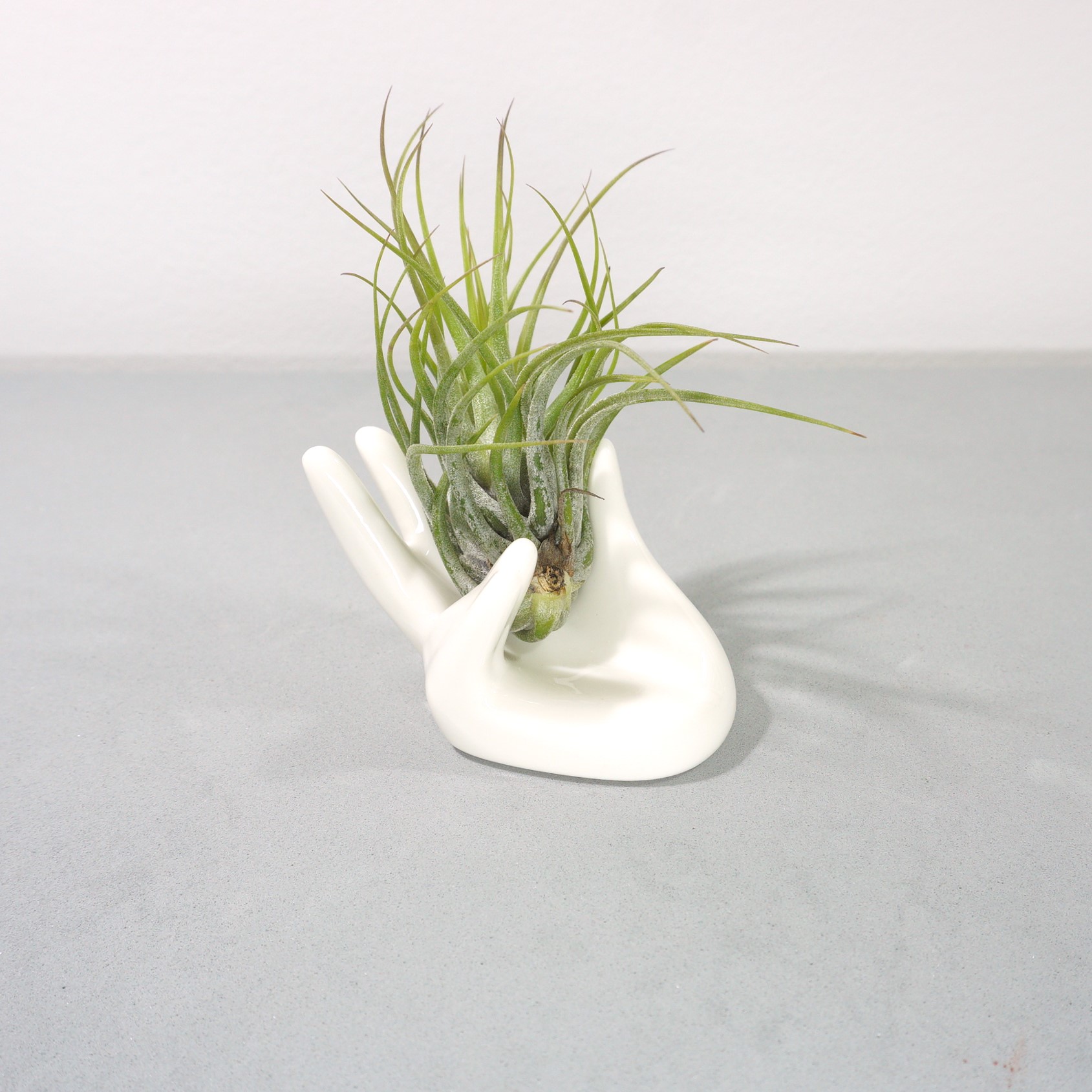 Realça a beleza da tua Tillandsia scaposa com este suporte de cerâmica em forma de mão, ideal para criar uma peça decorativa elegante e original. A planta é colocada cuidadosamente na palma da mão, ficando em destaque e criando um efeito visual moderno e harmonioso.