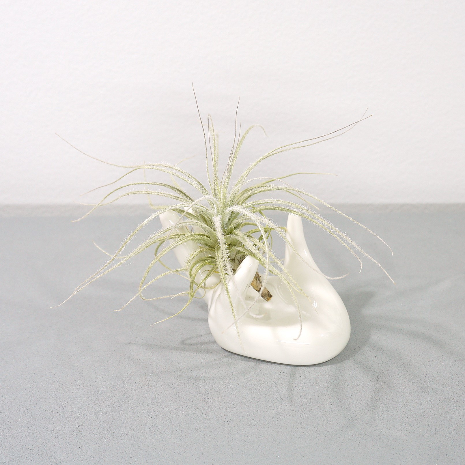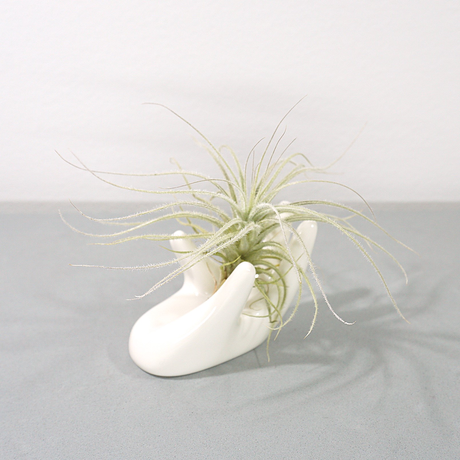 Realça a beleza da tua Tillandsia tectorum com este suporte de cerâmica em forma de mão, ideal para criar uma peça decorativa elegante e original. A planta é colocada cuidadosamente na palma da mão, ficando em destaque e criando um efeito visual harmonioso e moderno.